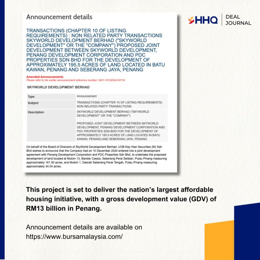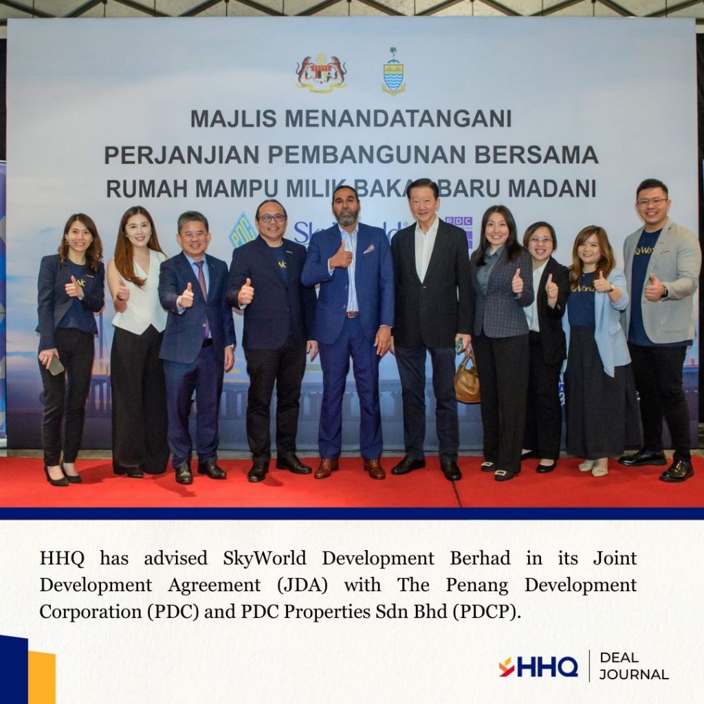 HHQ advised SkyWorld Development Berhad in its Joint Development Agreement (JDA) with Penang Development Corporation (PDC) and Properties Sdn Bhd (PDCP). This project is set to deliver the nationโ€™s largest affordable housing initiative, with a gross development value (GDV) of RM13 billion in Penang.