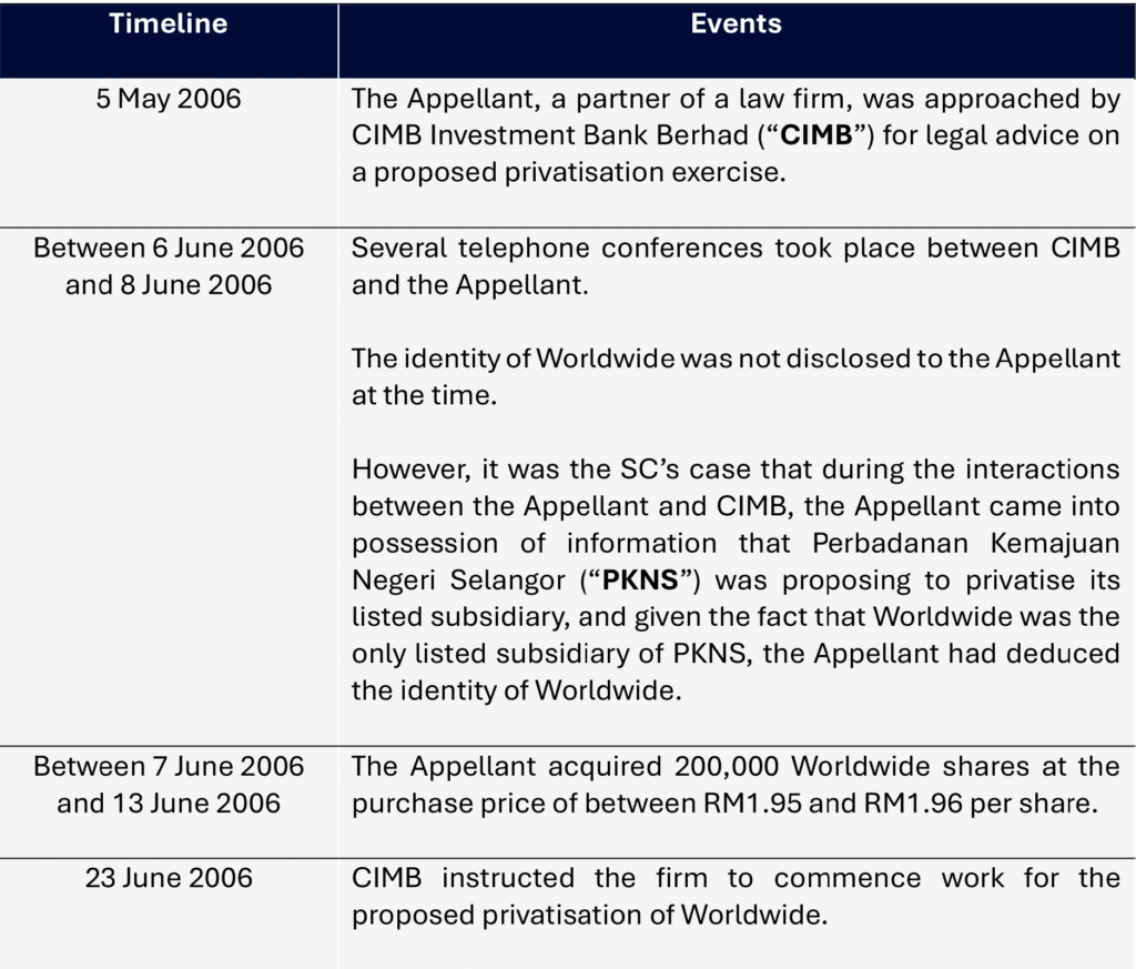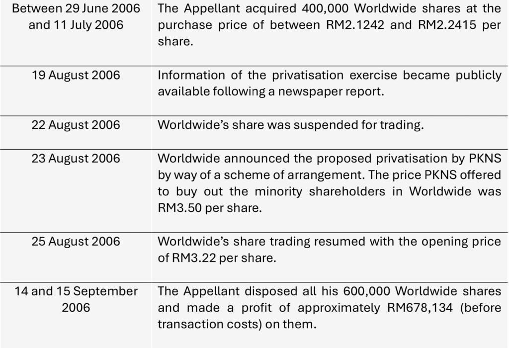 The case concerns the Securities Commission of Malaysia (“SC”) who instituted proceedings against Sreesanthan a/l Eliathamby (“Appellant”) for insider trading involving the acquisition of 600,000 shares in Worldwide Holdings Berhad (“Worldwide”), which was a public listed company. The relevant timeline of the background facts is set out below: