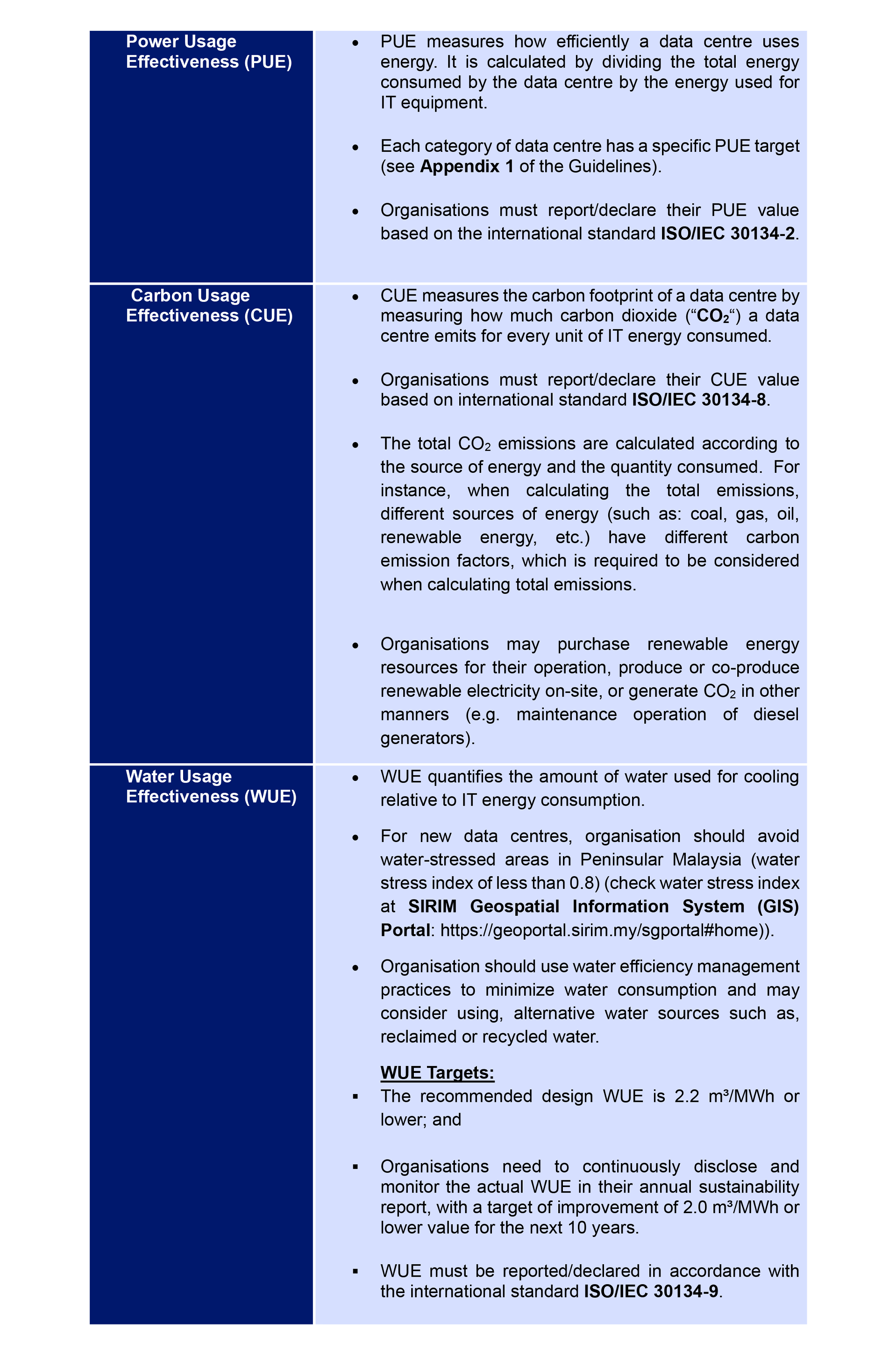 To be recognized as a sustainable data centre in Malaysia, organisations must meet the following key sustainability metrics, as provided under the Guidelines: –
