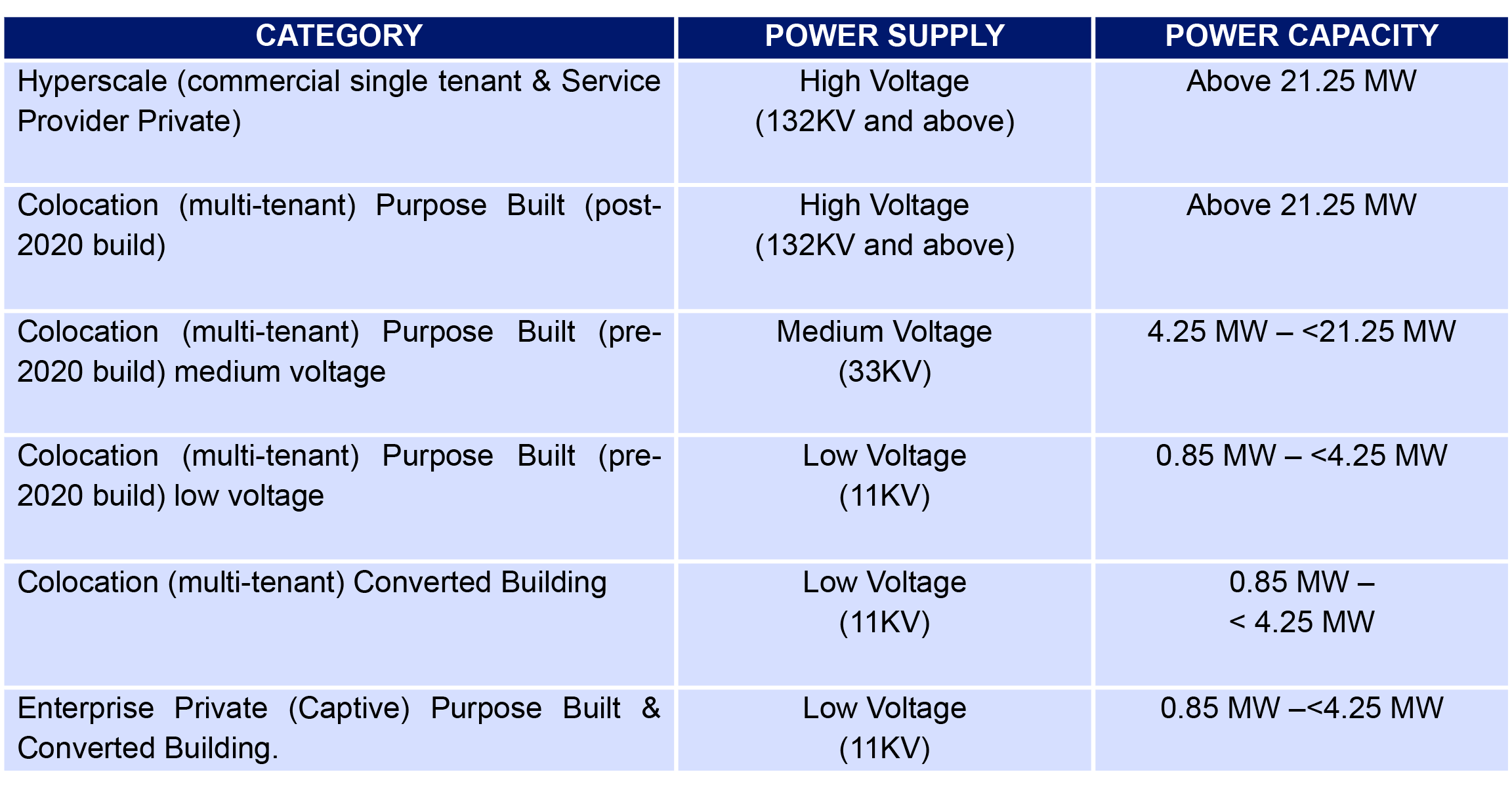 The Guidelines categorise the data centres into six categories based on their size, power usage, and infrastructure type, as follows: