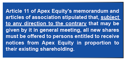 The High Court Judge concluded that there was no breach of pre-emption rights since shareholders had approved the proposed placement. The shareholders would reasonably understand that a private placement would dilute their interest, even without explicit mention in the circular. Thus, the absence of specific language denoting pre-emption waiver couldn’t be deemed as oppressive as long as the transaction’s effects were reasonably clear to Apex Equity’s shareholders.